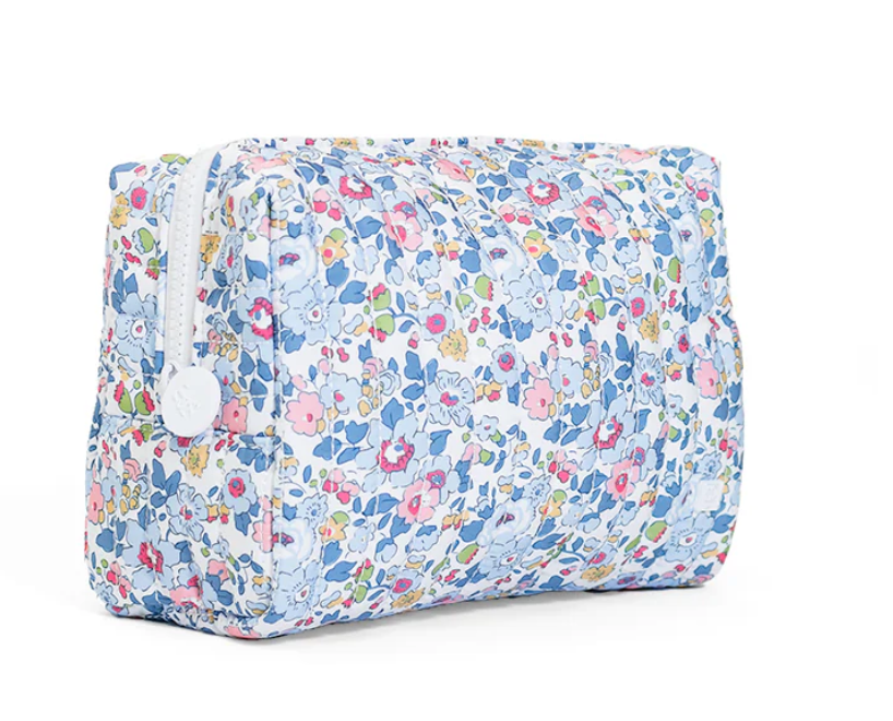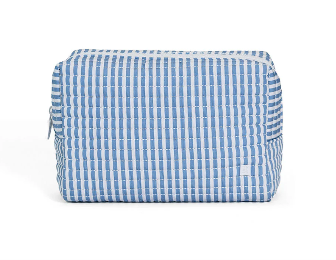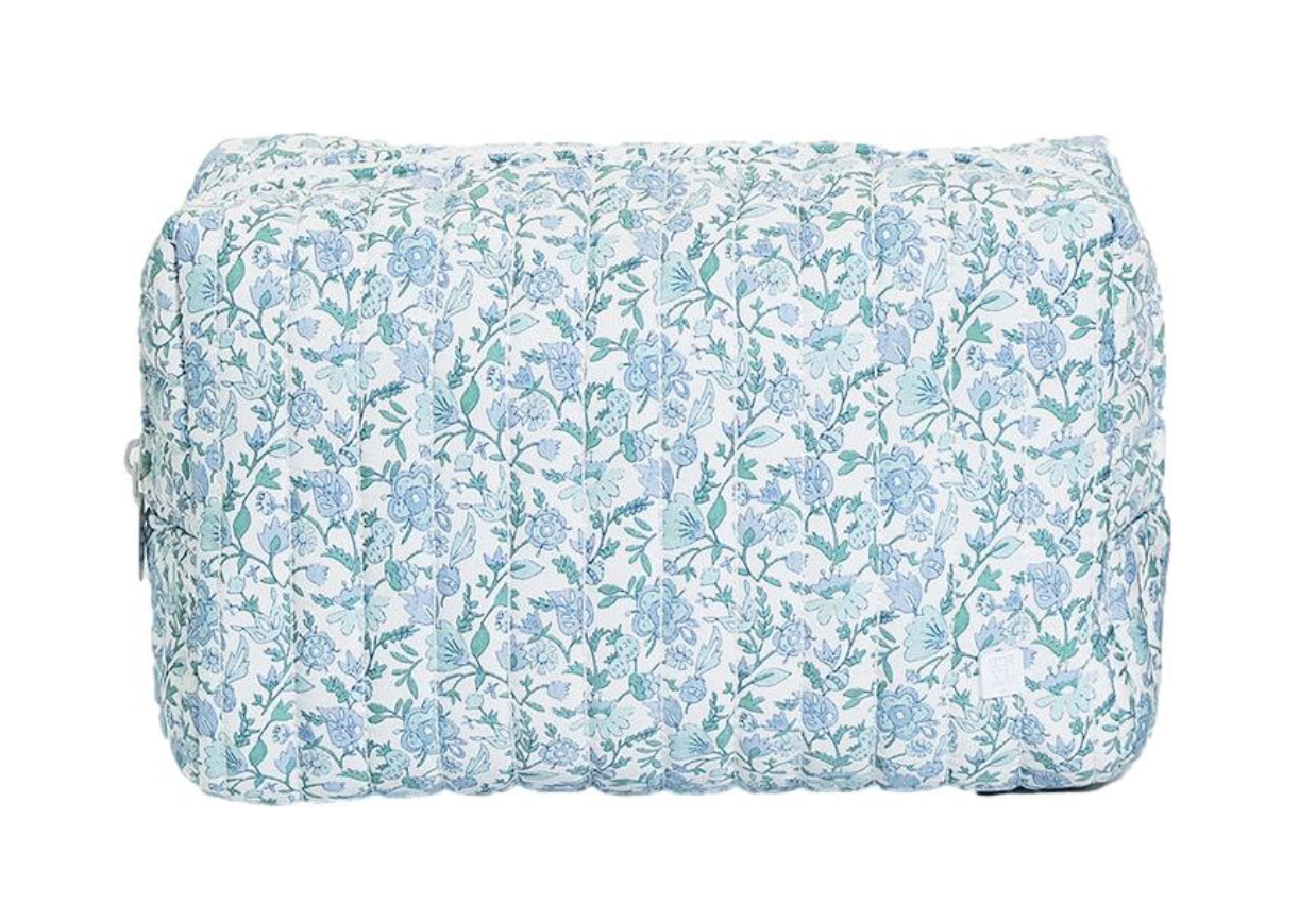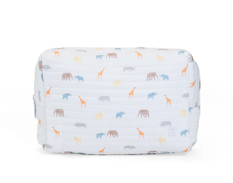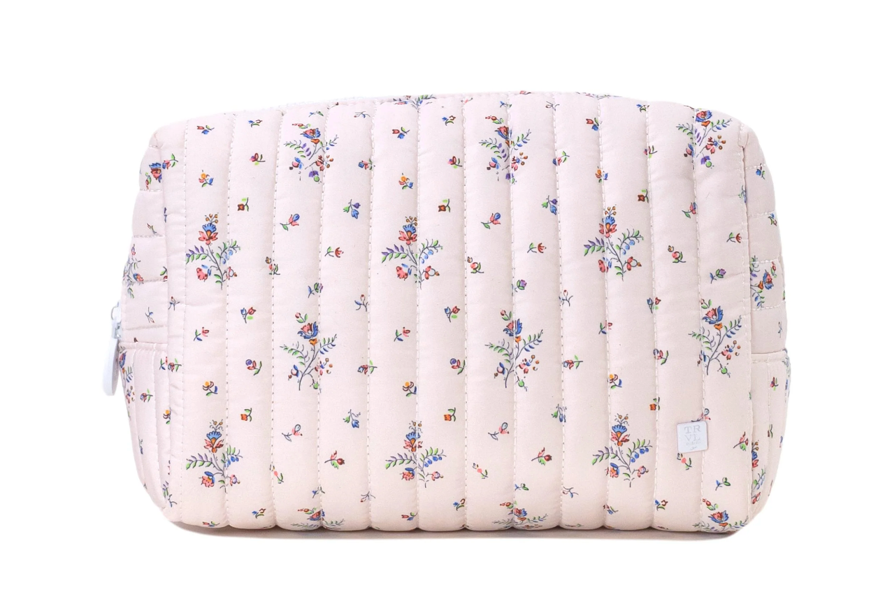 This ultimate large, soft, light weight quilted zippered pouch is ideal for diapers, wipes, toiletries, cosmetics and everything in between. It is designed to stand on its own and has an interior pocket for small needs. Wipeable inside and out and machine washable