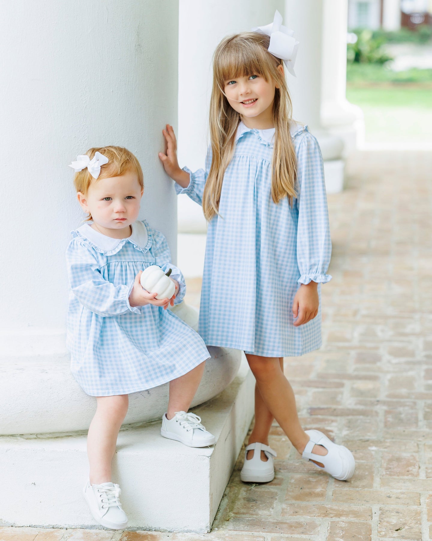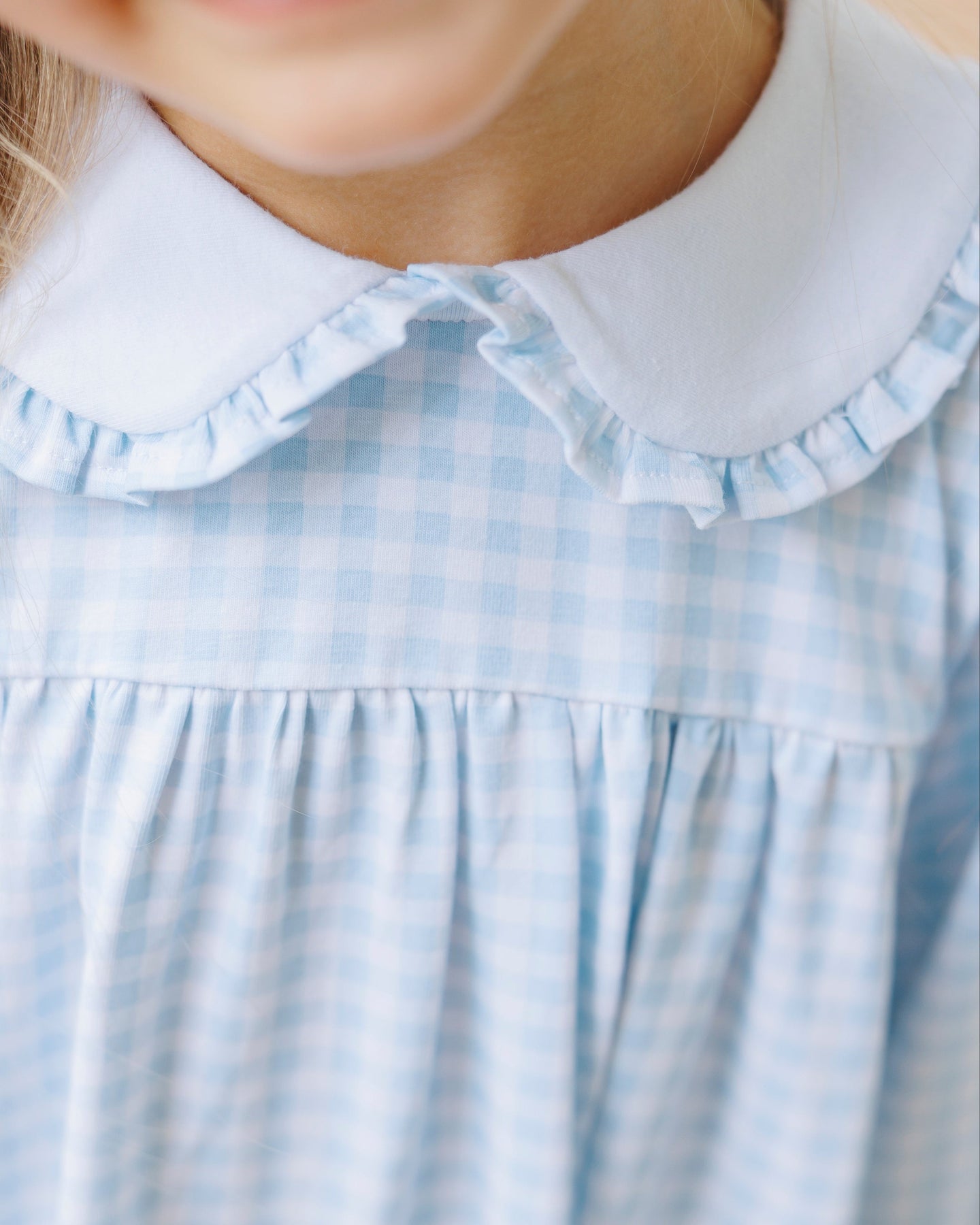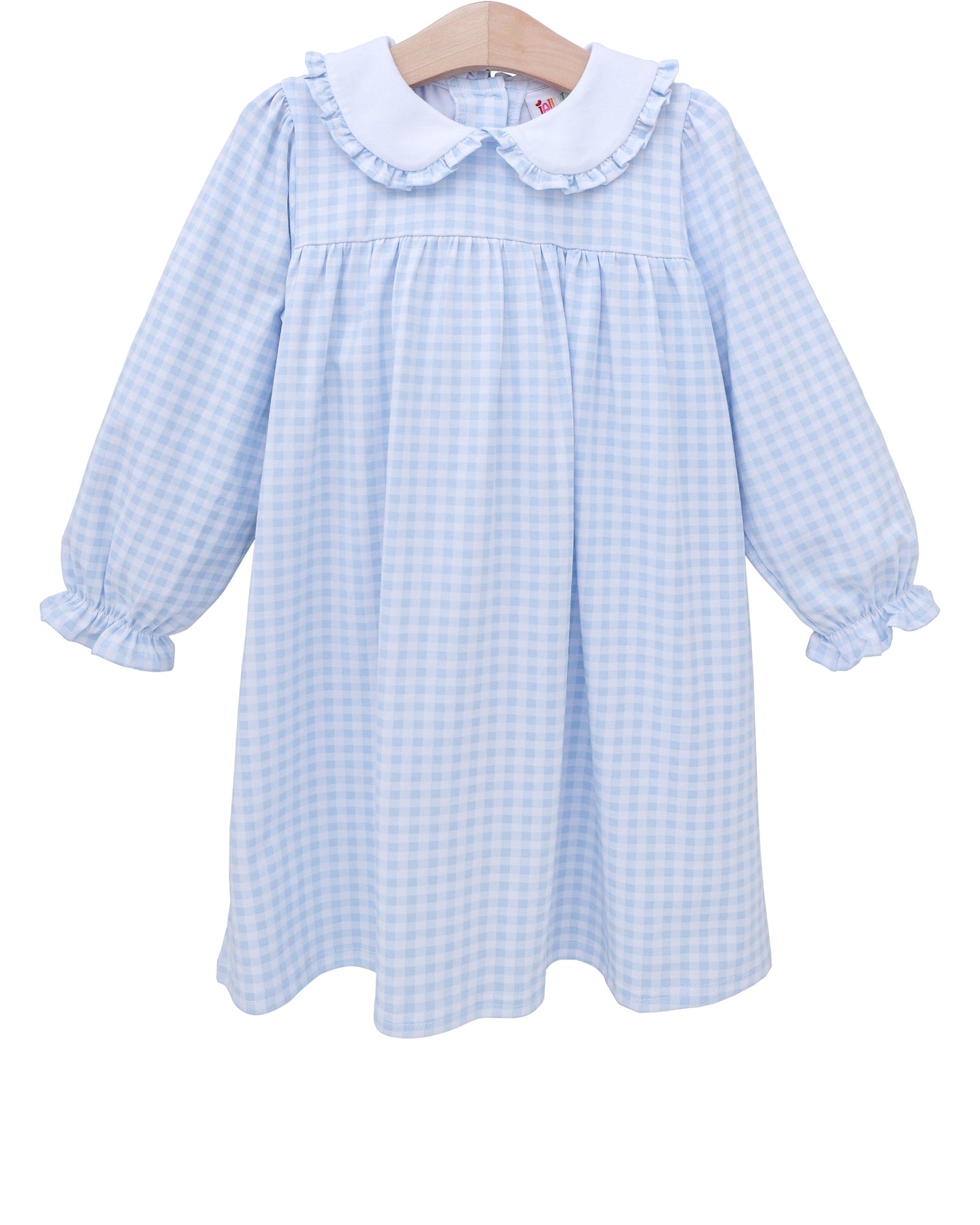 Twirl into autumn with our Catherine Dress in light blue gingham! This charming long sleeve dress features an adorable ruffle peter pan collar that adds just the right touch of whimsy. Perfect for any fall adventure, this playful pattern brings classic charm to cooler days. Watch little ones light up with delight in this sweet seasonal favorite!