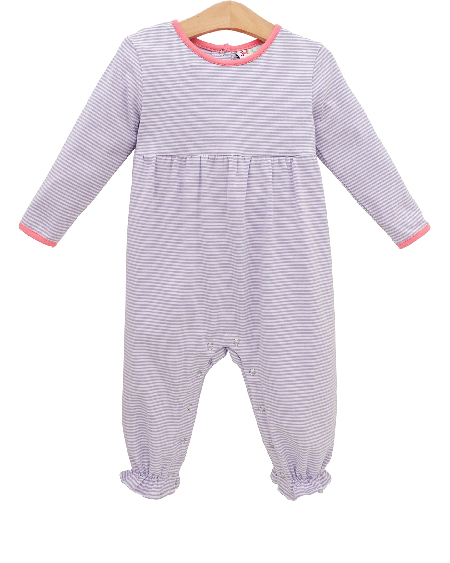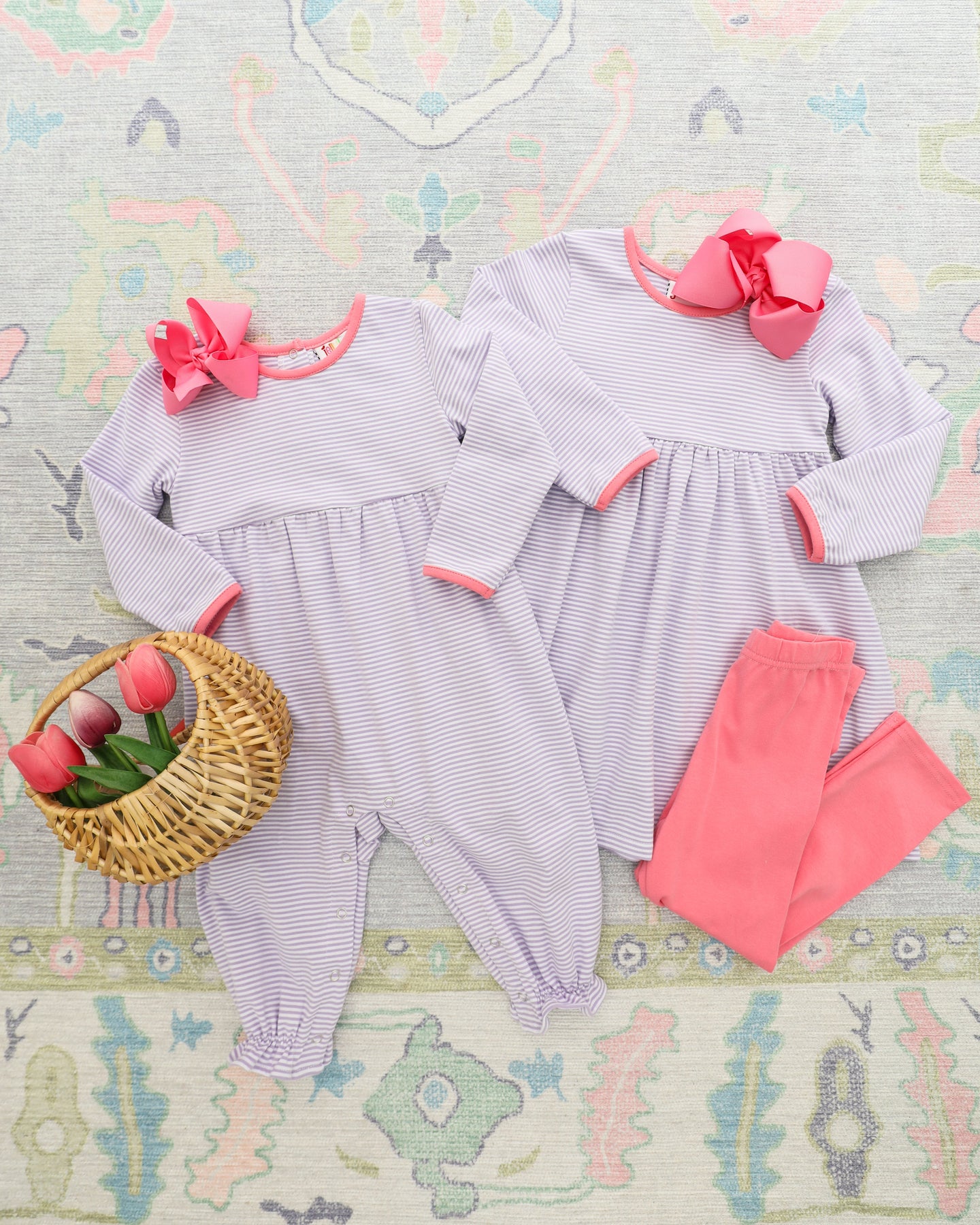 This adorable long sleeve Sadie Romper in Purple Stripe/Pink is your little one's ticket to all-day cuteness! Perfect for playdates, family gatherings, or just looking extra sweet. Add a personal touch with monogramming or enjoy its charming design as is. Comfy, versatile, and oh-so-adorable for every special moment!