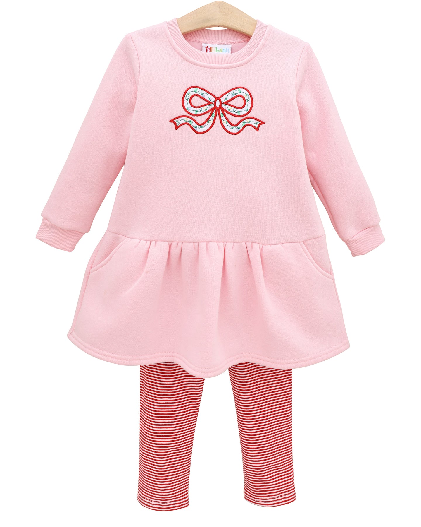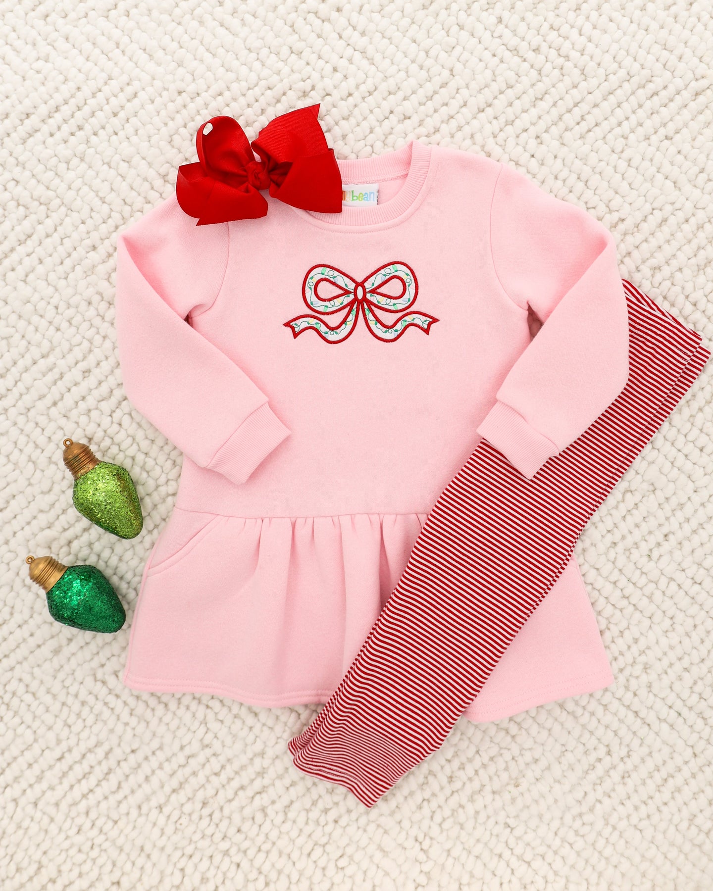 Get festive and cozy with the Merry & Bright Bow Tunic Sweatshirt Set! This playful pink sweatshirt features a charming Christmas bow applique, perfectly paired with red striped leggings for a fun holiday look. Ideal for spreading cheer and staying comfy all season long.